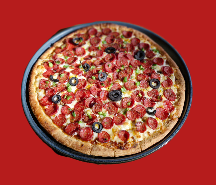 نان پیتزا آمریکایی.چوریتسو.قارچ.سس مارینارا.فلفل دلمه نگینی.پنیر موزارلا . زیتون
